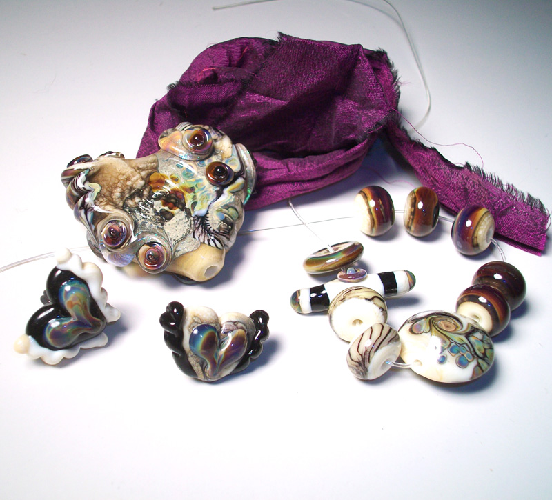 A NEW design heart focal in the "Ancient Tablet" series style, NEW 2 winged-heart buttons, some "Cream Rainbow Ribbon" spacers and some extras from the other beads I made, along with another piece of sari silk.